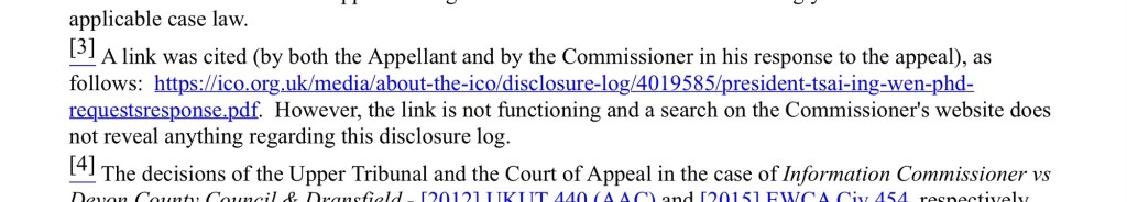 The Appellant stated in his grounds of appeal that after he had complained to the Commissioner about the Authority’s response to the Request, the Commissioner published on the ICO’s website (by reference to a disclosure log) a new policy of not processing FOIA requests seeking information on President Tsai Ing-wen’s PhD.